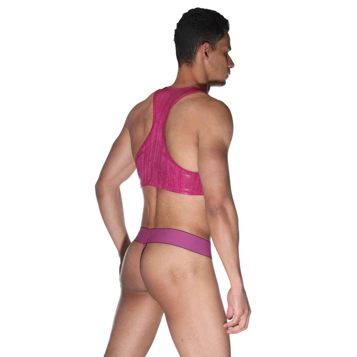 Комплект для мужчин, состоящий из топа на серебристой молнии, и трусов-тонгов на очень широкой резинке. Комплект из мягкой, гладкой и блестящей ткани. В комплекте: топ, трусы.