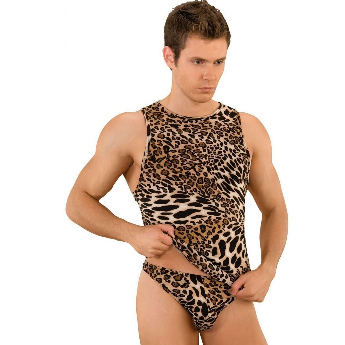 Майка-борцовка для мужчин на широких лямках красочной леопардовой расцветки. Трусики не входят в комплект!