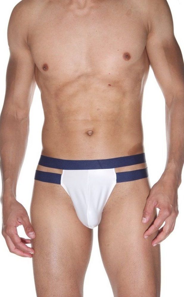 Мужские трусы из гладкого белого материала на двойном темно-синем поясе.