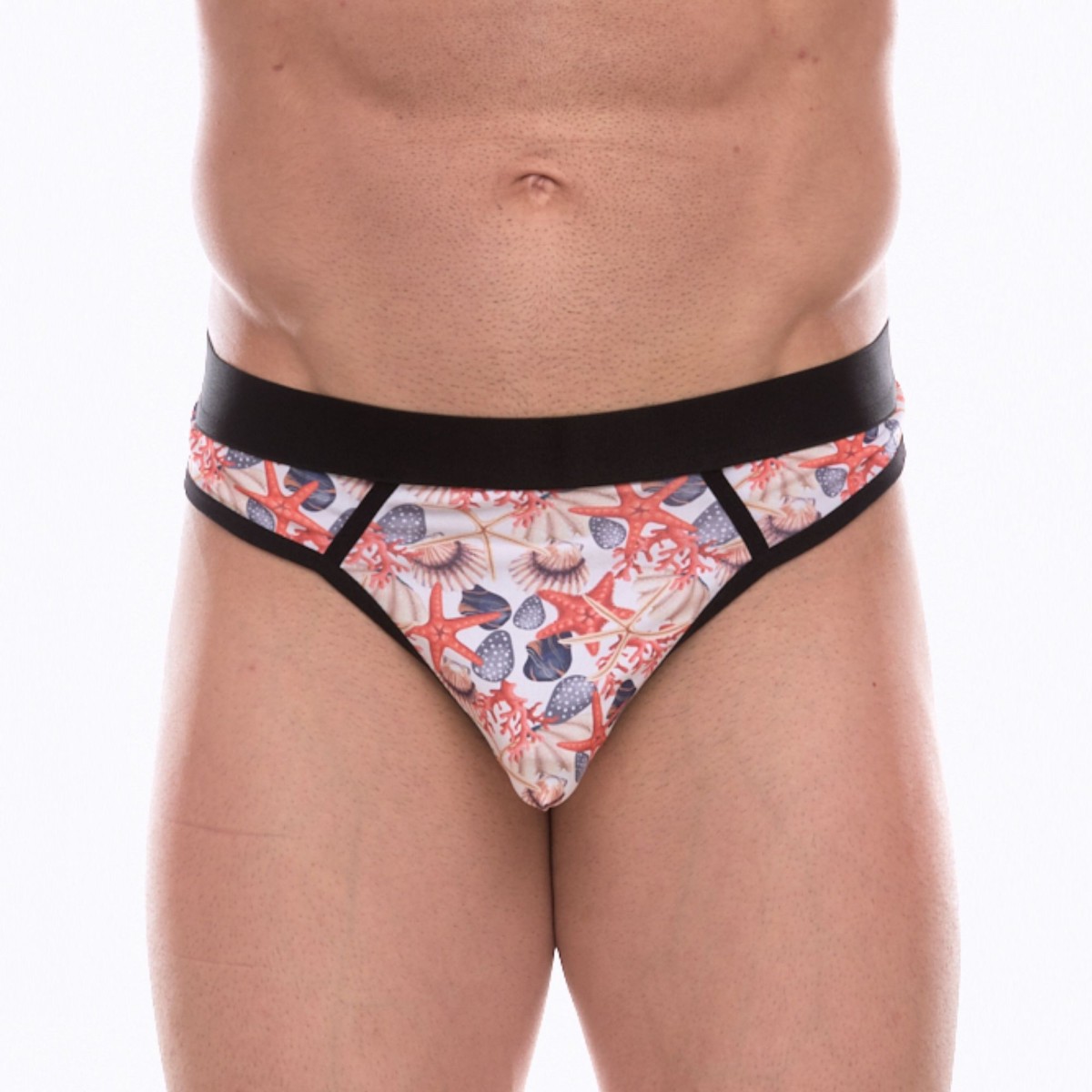 Мужские трусы-стринги с принтом в виде разноцветных ракушек.