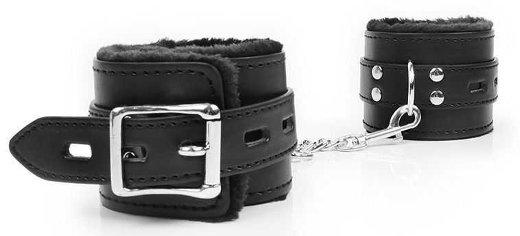 Великолепные оковы под кожу для любителей БДСМ-игр! Внутренняя сторона изделий отделана мехом, который препятствует натиранию кожи. Размер оков регулируется с помощью ремней. Оковы соединяются между собой металлической цепочкой.