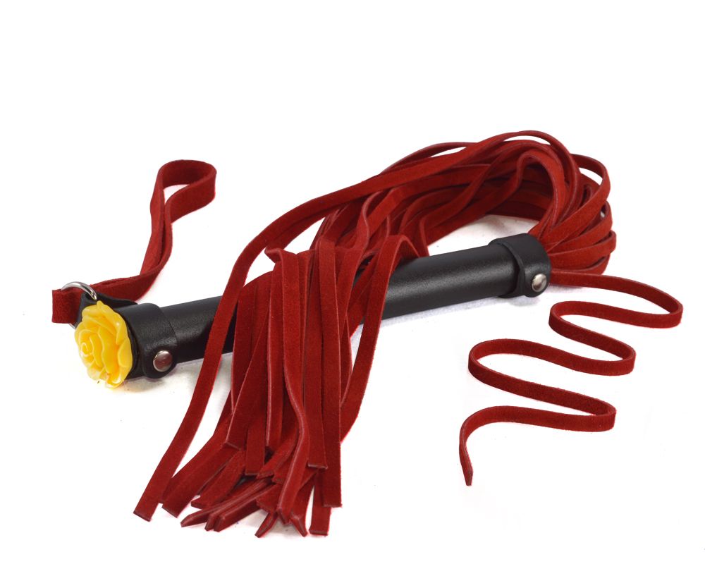 Плеть изготовлена из натуральной велюровой кожи. Цвет черный. Торец металлической рукояти украшена акриловой розой. Количество лент в хвосте 25-26. Длина рукояти - 17 см.